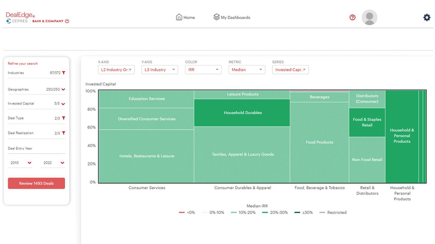 DealEdge has a wealth of expert analytics to help you understand your sectors, your peer group, and your own activity. It is shaped by decades of private equity expertise from industry leaders Bain & Company, and based on CEPRES’s market-leading cash flow data. Our insights are based on more than 39,000 private equity deals across more than 570 industry subsectors.