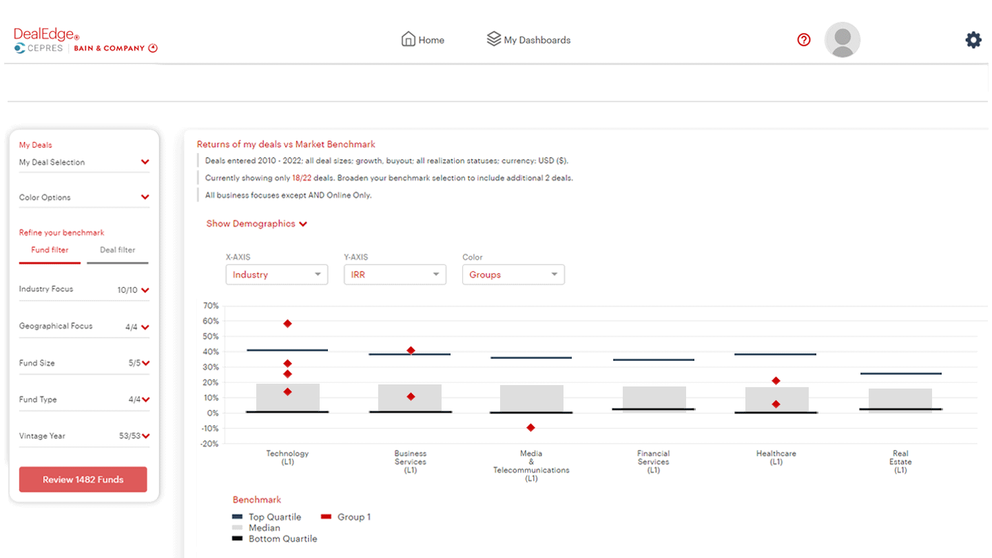 In such a competitive atmosphere, specialization is key to getting an edge. With DealEdge, you can explore the private equity landscape and compare pricing, performance, and value creation in different private equity subsectors.