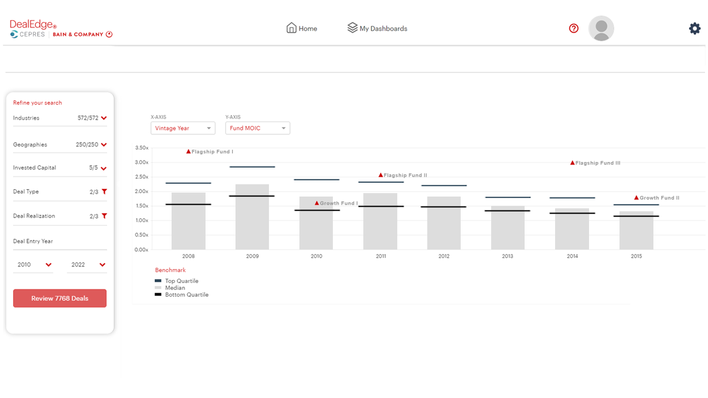 Refine your focus by how much activity your peers have recorded in specific sectors, as well as invested equity capital size, vintage year, geographic and sector focus, and more. Drill down to just your most relevant peer group benchmarks to make sure you’re leveraging the most actionable competitive insights.