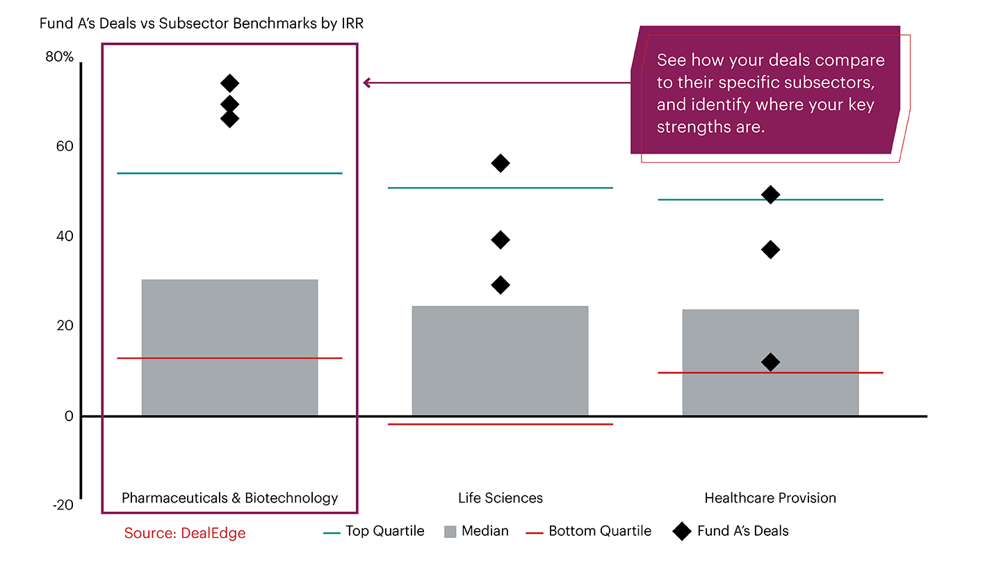 Source: Median healthcare deal IRRs vs Fund A’s executed dealsWith DealEdge, you can identify areas where you have outperformed the market, and areas where your approach isn’t yielding top results. This intelligence gives you unprecedented context to help finetune your strategy on a level that commingled fund performance cannot emulate.